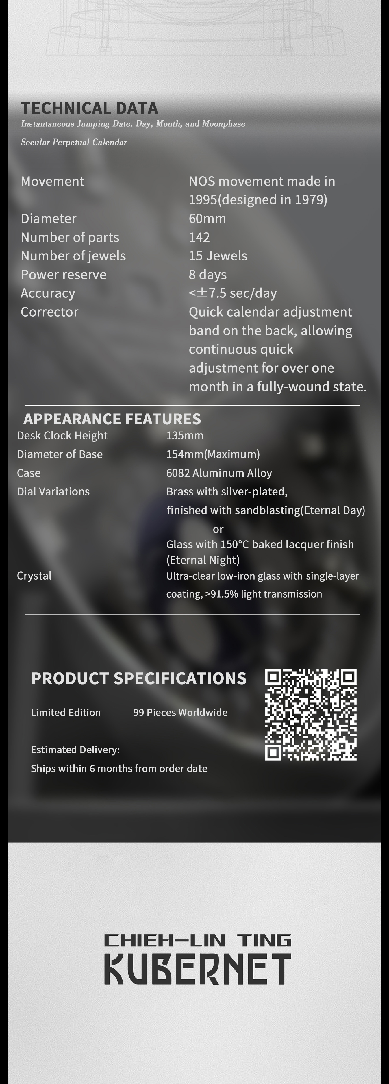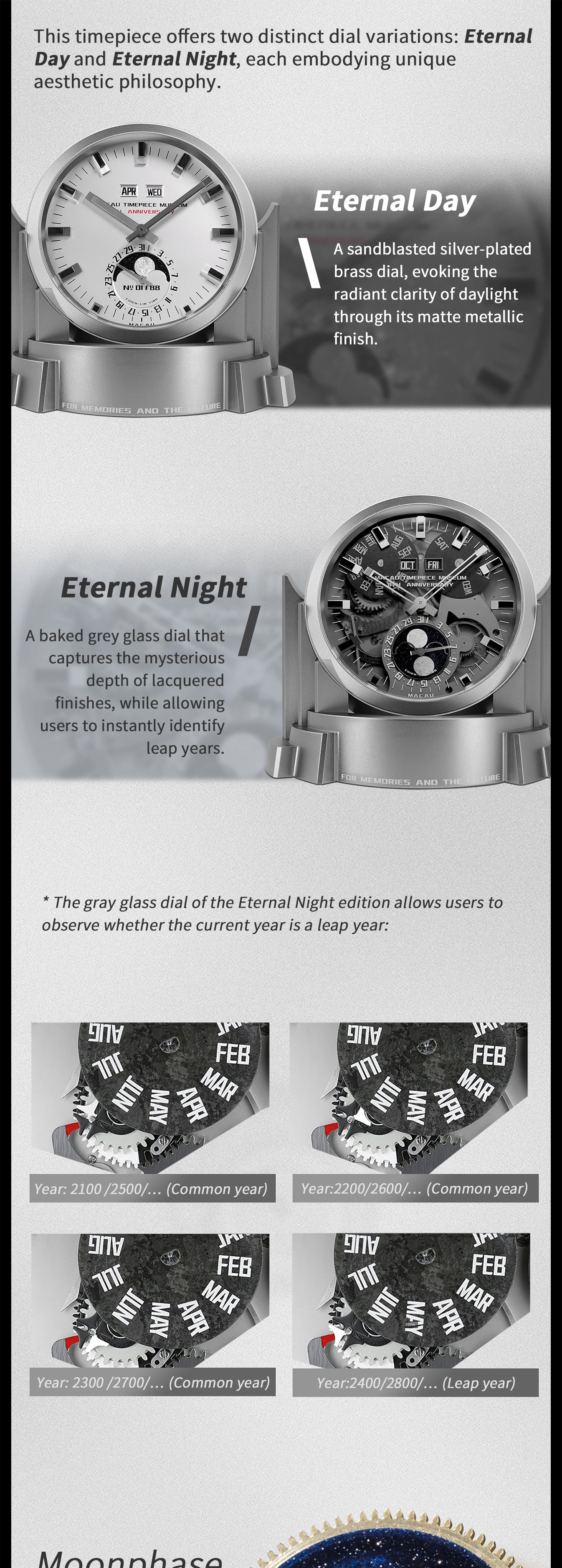 - Dial Variations:Brass with silver-plated, finished with sandblasting(Eternal Day ) or Glass with 150°C baked lacquer finish(Eternal Night )